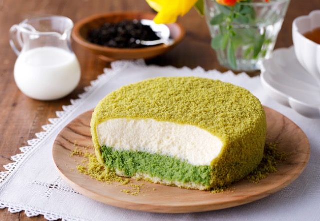 下層のベイクドチーズケーキには、抹茶本来の爽やかな苦みと香りが楽しめるように、宇治抹茶を混ぜ合わせています。