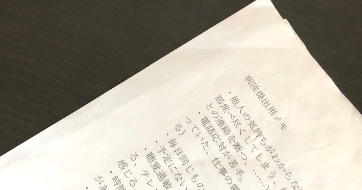 なんとか電車に乗って出社したが、朝の会議を抜け出て、内科に駆け込んだ。医師は「あなたはここじゃないね」と言った。内科医に促された通り、精神科を訪れた。1カ月の休職を指示された。鬱だった。